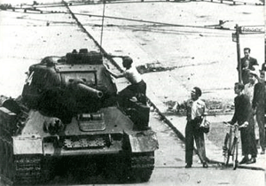 Röda armens pansar plöjer fram i de demonstrerande folkmassorna